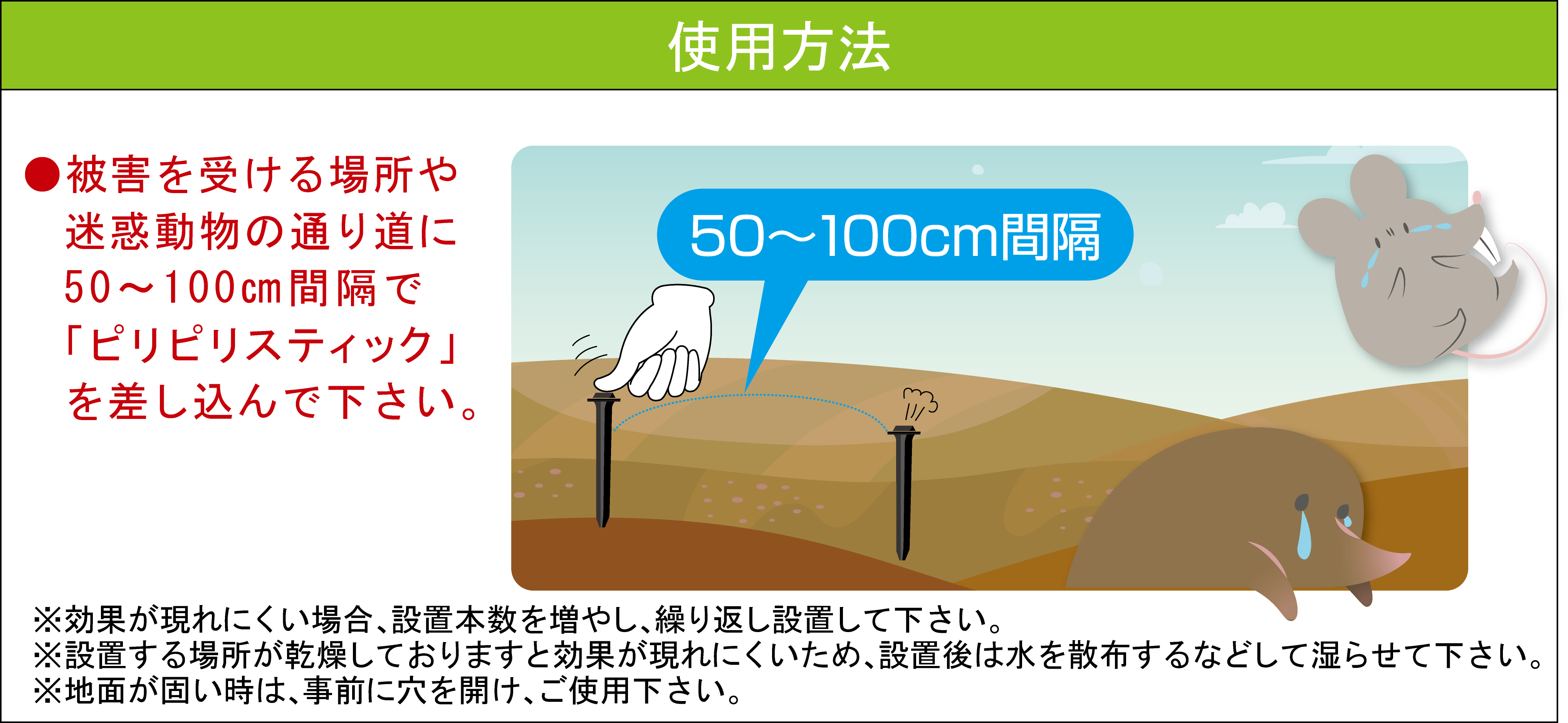 被害を受ける場所や迷惑動物の通り道に、50~100cm間隔でピリピリスティックを差し込みます。